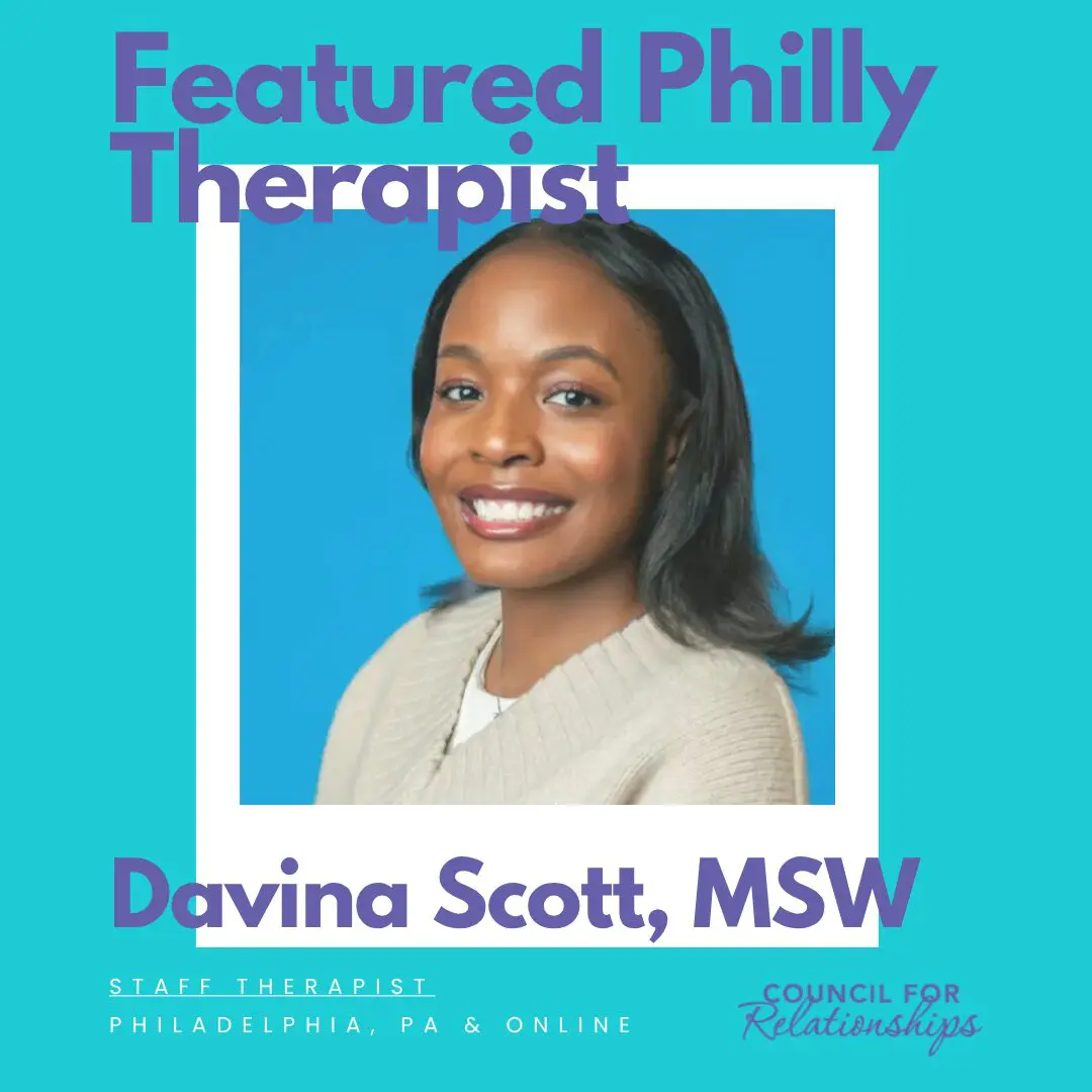 Davina Scott, MSW, is a Staff Therapist at Council for Relationships. She sees clients virtually across Pennsylvania and in person at our Center City Philadelphia office. Davina specializes in helping clients who are feeling stuck in life, navigating trauma, or rebuilding their sense of identity. Her integrative approach includes IFS therapy, CBT, mindfulness, and somatic practices. She is a trauma-informed therapist committed to creating a space where clients feel safe, supported, and empowered.